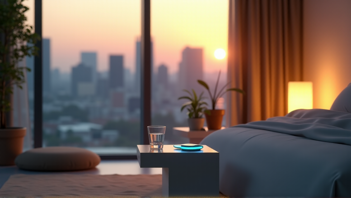"A serene bedroom scene at dusk featuring a smart sleep tracker on a minimalist nightstand surrounded by calming objects and warm sunlight."